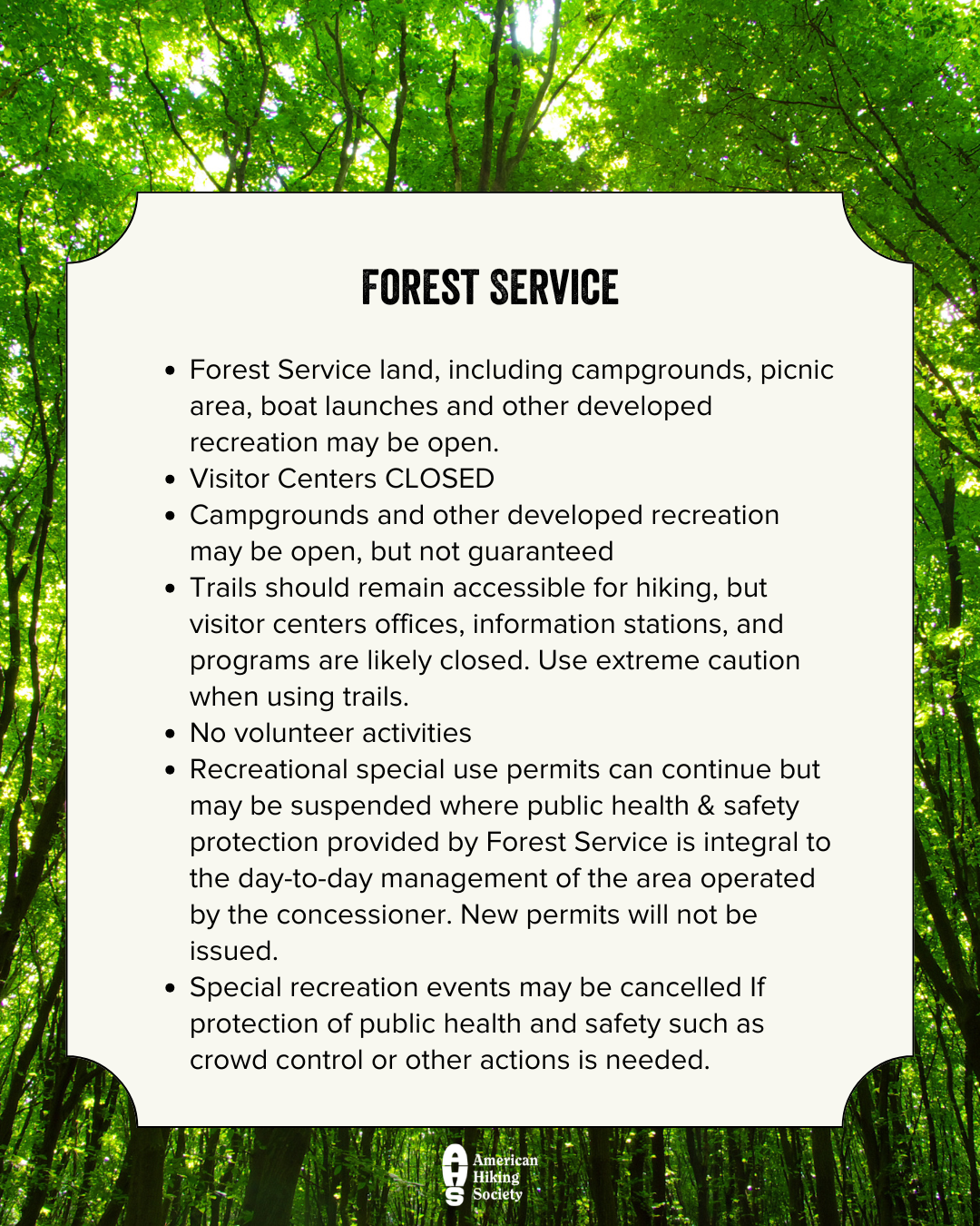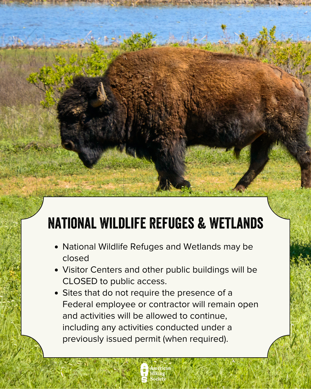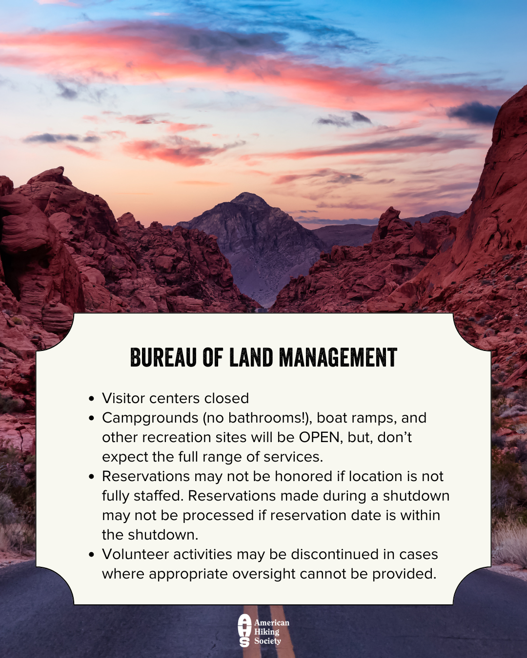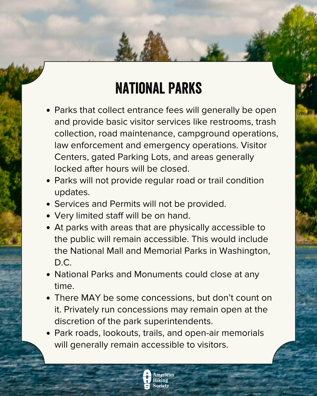 - Share your shutdown hiking experience and conditions with AHS on Facebook, Twitter (@AmericanHiking), and Instagram (@americanhiking)
