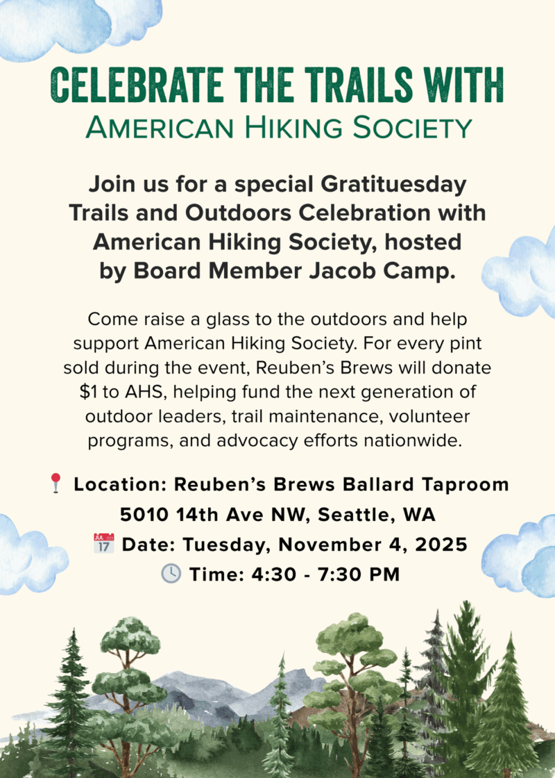 Seattle, WA — American Hiking Society (AHS), the national voice for America’s hiking community, is proud to partner with Reuben’s Brews for a special fundraising event to celebrate another impactful year of trail stewardship and advocacy. Hosted by Reuben’s Brews as part of their beloved Gratituesday series, the Trails and Outdoors Celebration with American Hiking Society will take place on Tuesday, November 4, 2025, from 4:30 PM to 7:30 PM at Reuben’s Brews Ballard Taproom, located at 5010 14th Ave NW, Seattle, WA 98107.
