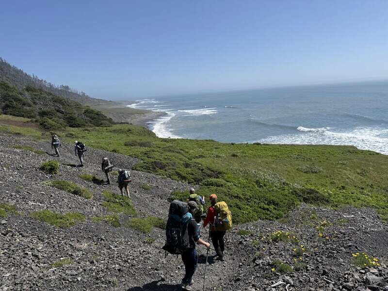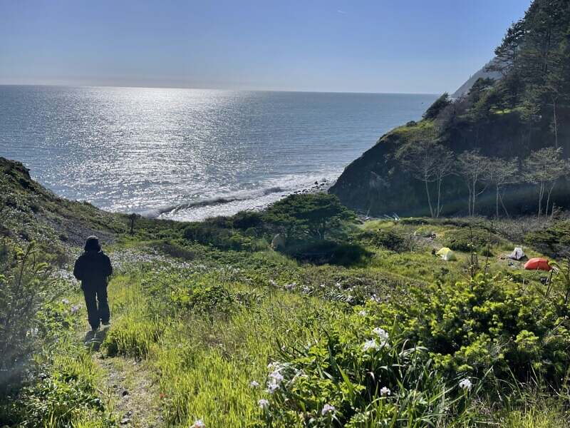 Primitive backcountry wilderness sites during trip. On arrival day and eve of departure day, volunteers will camp outside of the staff barracks at the King Range National Conservation Area and have direct access to bathrooms with flushing toilets and three showers, laundry facilities, a full kitchen, and wifi. Volunteers need to bring their own backpack, tent and personal camping gear; water filtration, sheets, bedding or sleeping bag; towels; and personal cup, bowl, mug, and eating utensils.